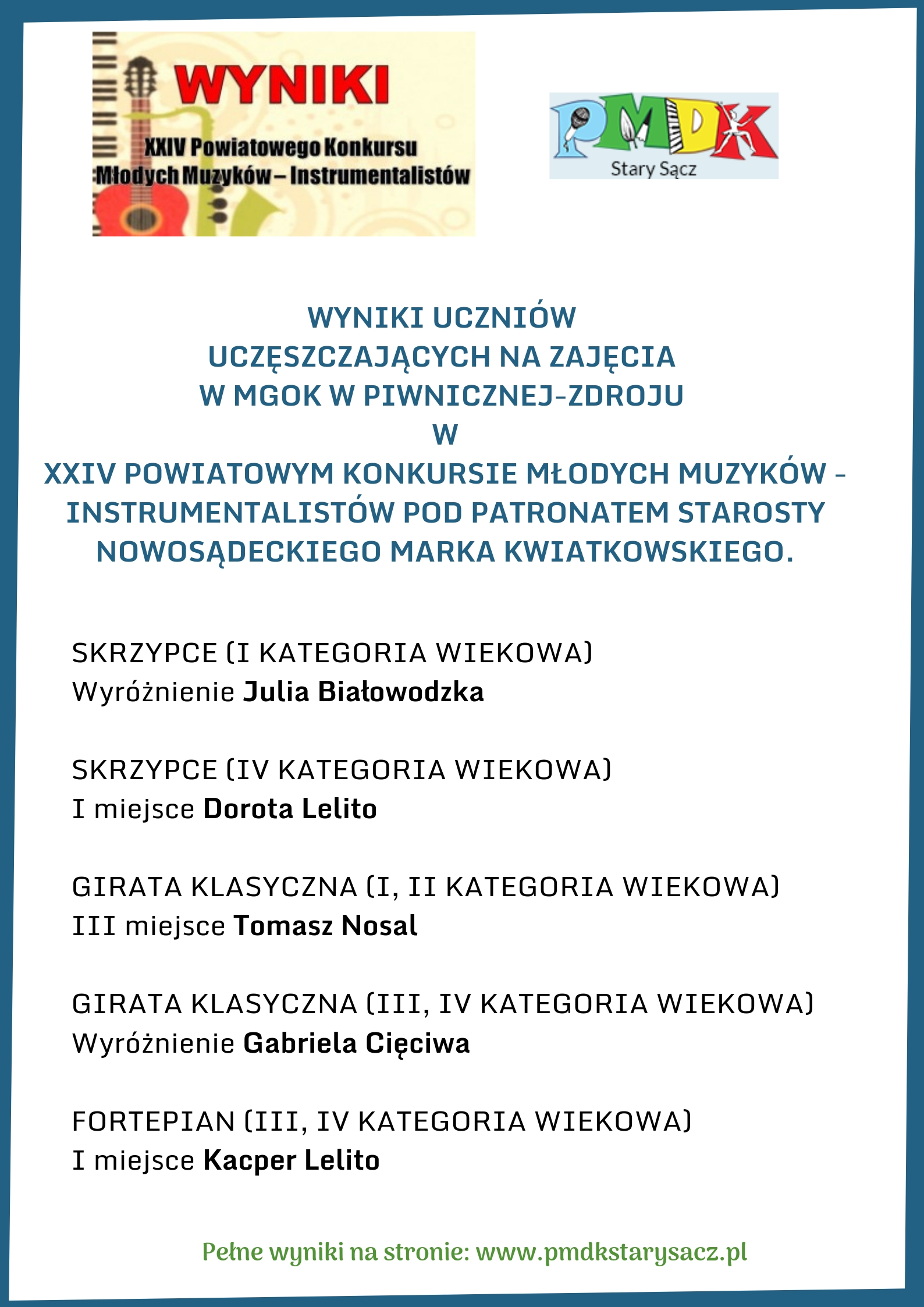 Drukuj Powrót do poprzedniej strony XXIV Powiatowy Konkurs Młodych Muzyków - Instrumentalistów pod patronatem Starosty Nowosądeckiego Marka Kwiatkowskiego - wyniki 15.05.2019 12:08 Treść