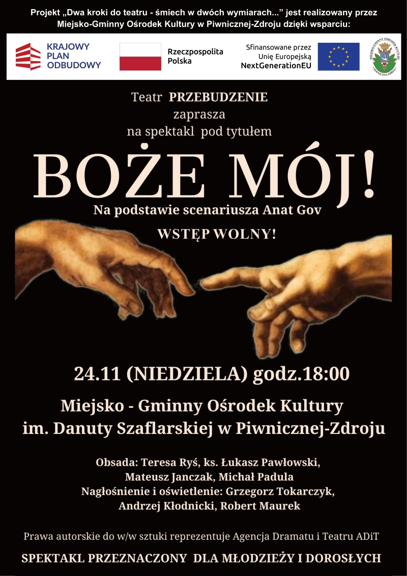 24 listopada /niedziela/ o godzinie 18:00 mamy przyjemność zaprosić Państwa na spektakl "Boże mój" w wykonaniu Teatru Przebudzenie" 😇
