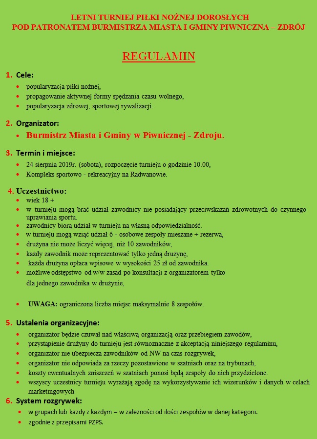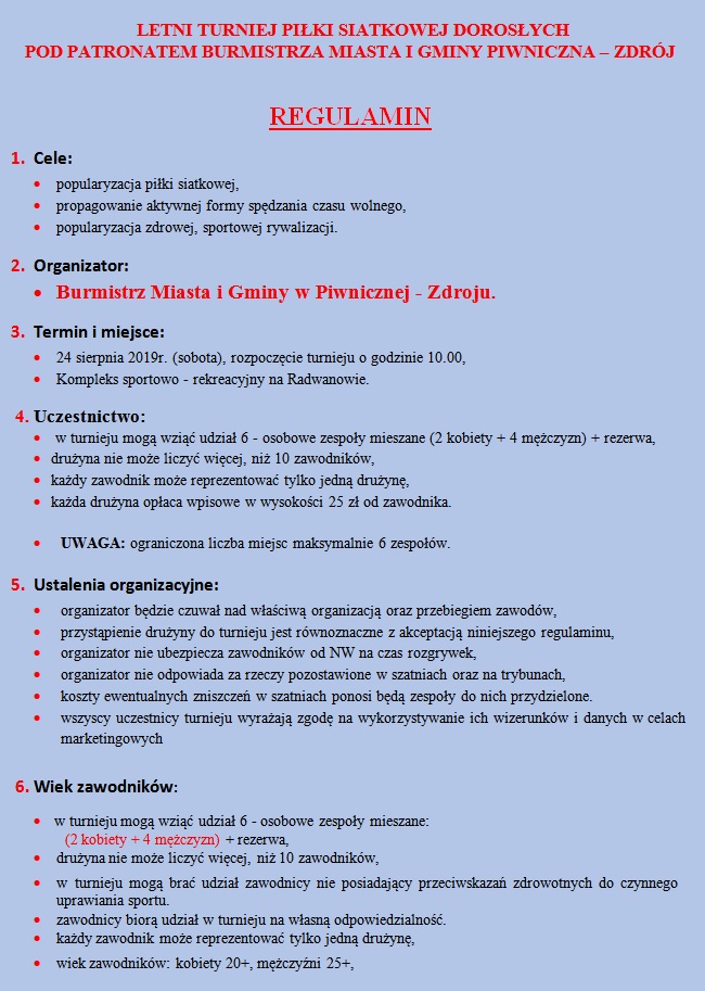 Drukuj Powrót do poprzedniej strony Letni turniej piłkarsko-siatkarski pod patronatem Burmistrza Miasta i Gminy Piwniczna-Zdrój 23.07.2019 16:26 Treść